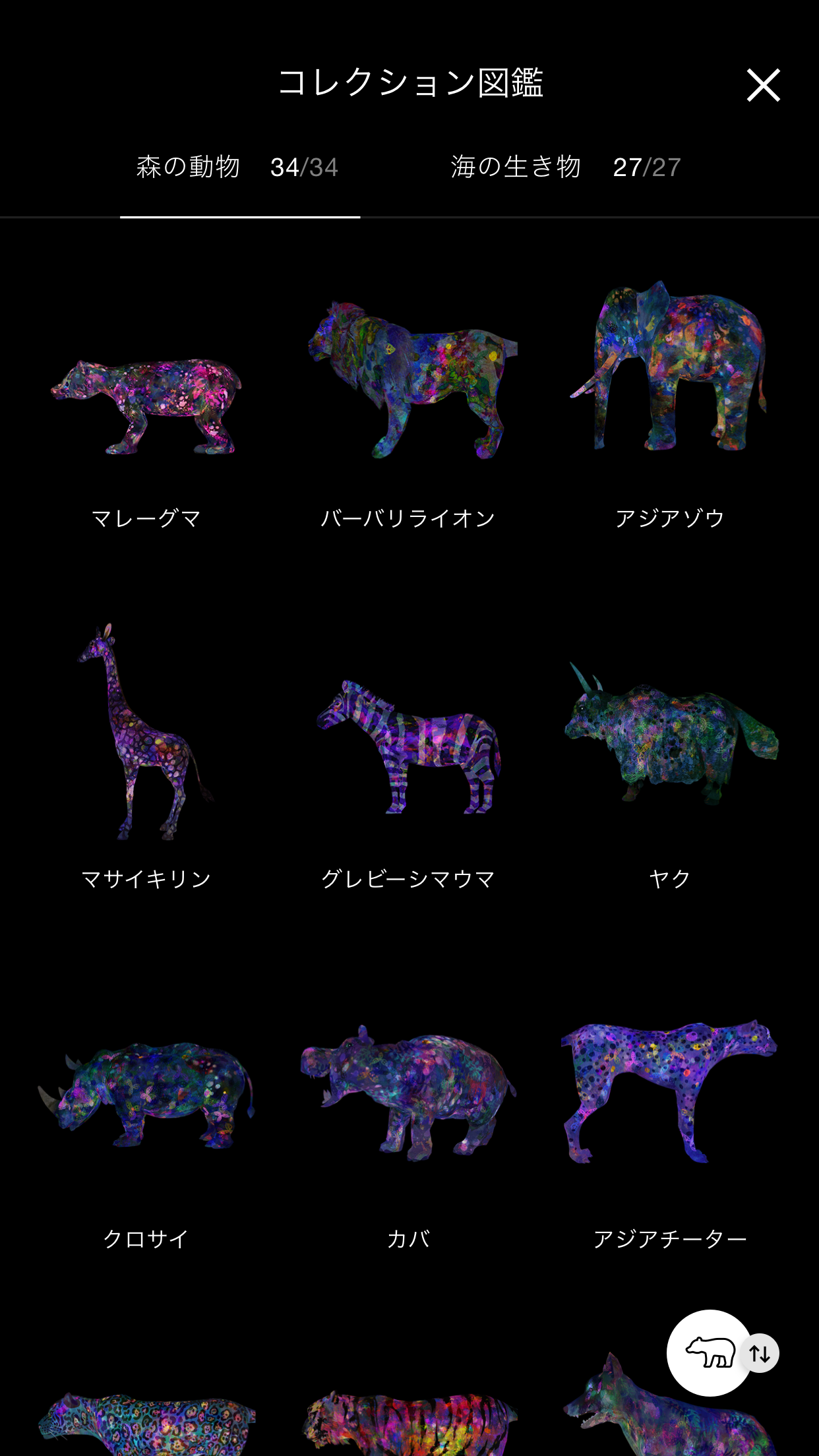 처음 입장하자마자 들어가게되는 곳은 바로 '채집의 숲'입니다. 이곳은 증강현실을 통해 동물을 채집한 후 놓아주는 체험형 학습을 경험할 수 있습니다. 팀랩 전용 앱을 다운로드하여 동물 수집을 할 수 있으며, 전시를 모두 관람한 후에도 수집한 동물들을 볼 수 있어 아이들이 너무 좋아하는 전시 중 하나입니다. 특히나 포켓몬을 수집해 봤던 사람이라면 무조건이죠. 어플은 영문으로도 이용가능하니 사진은 참고하는 것으로만 봐주세요.