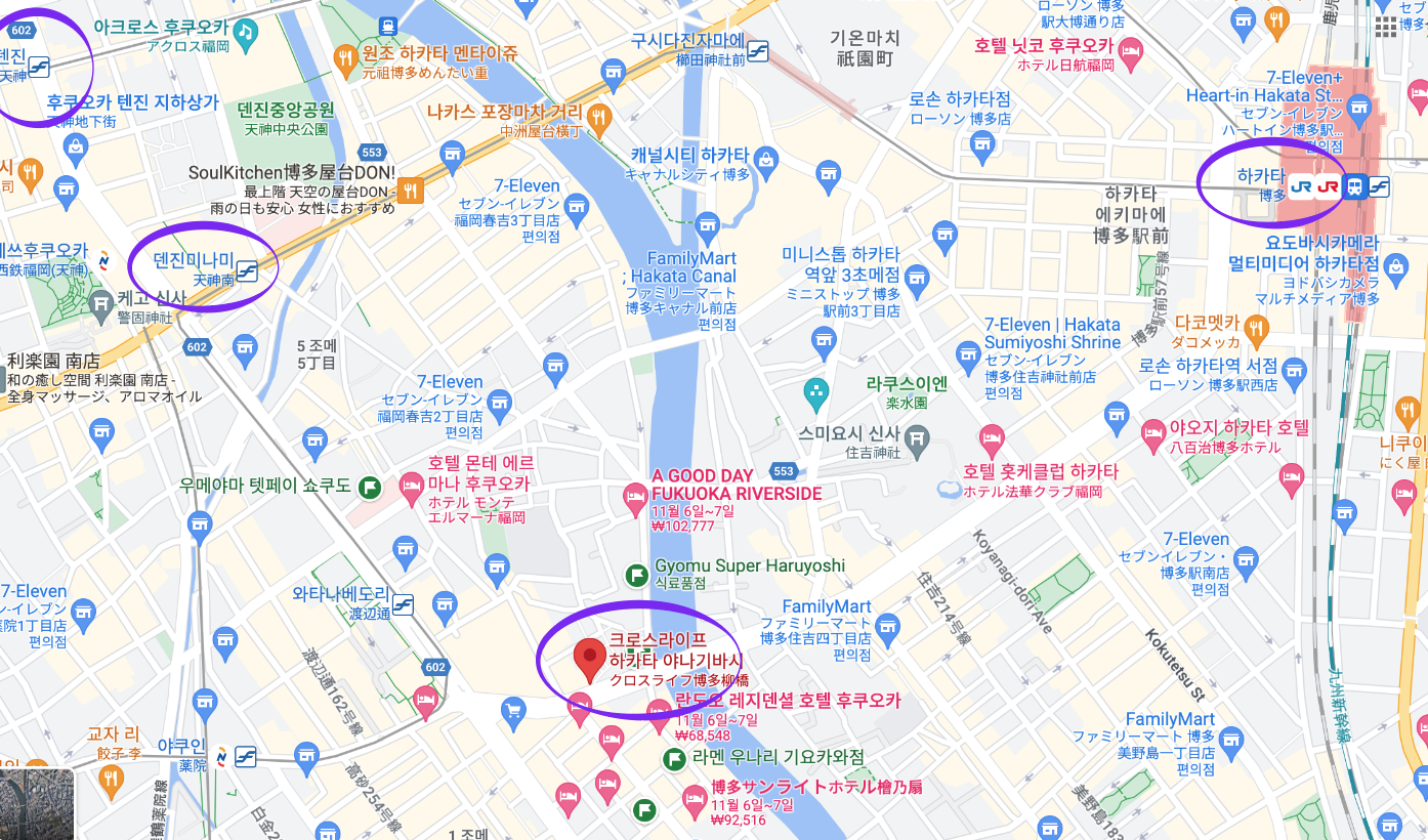 크로스라이프 하카타 야나기바시점은 하카타와 텐진 미나미 사이에 있습니다. 하카타역까지는 도보 15분정도 거리에 위치해 있고, 버스로는 2-3 정거장쯤 걸렸던 거 같아요. 많은 상점들과 맛집이 몰려있는 텐진미나미도 버스정류장으로는 1 정거장 그리고 도보로는 10분 정도의 거리에 위치해 있어서 저는 개인적으로 위치 멀지 않으면서 호텔 숙박비도 많이 아낄 수 있어서 만족도가 높았습니다.