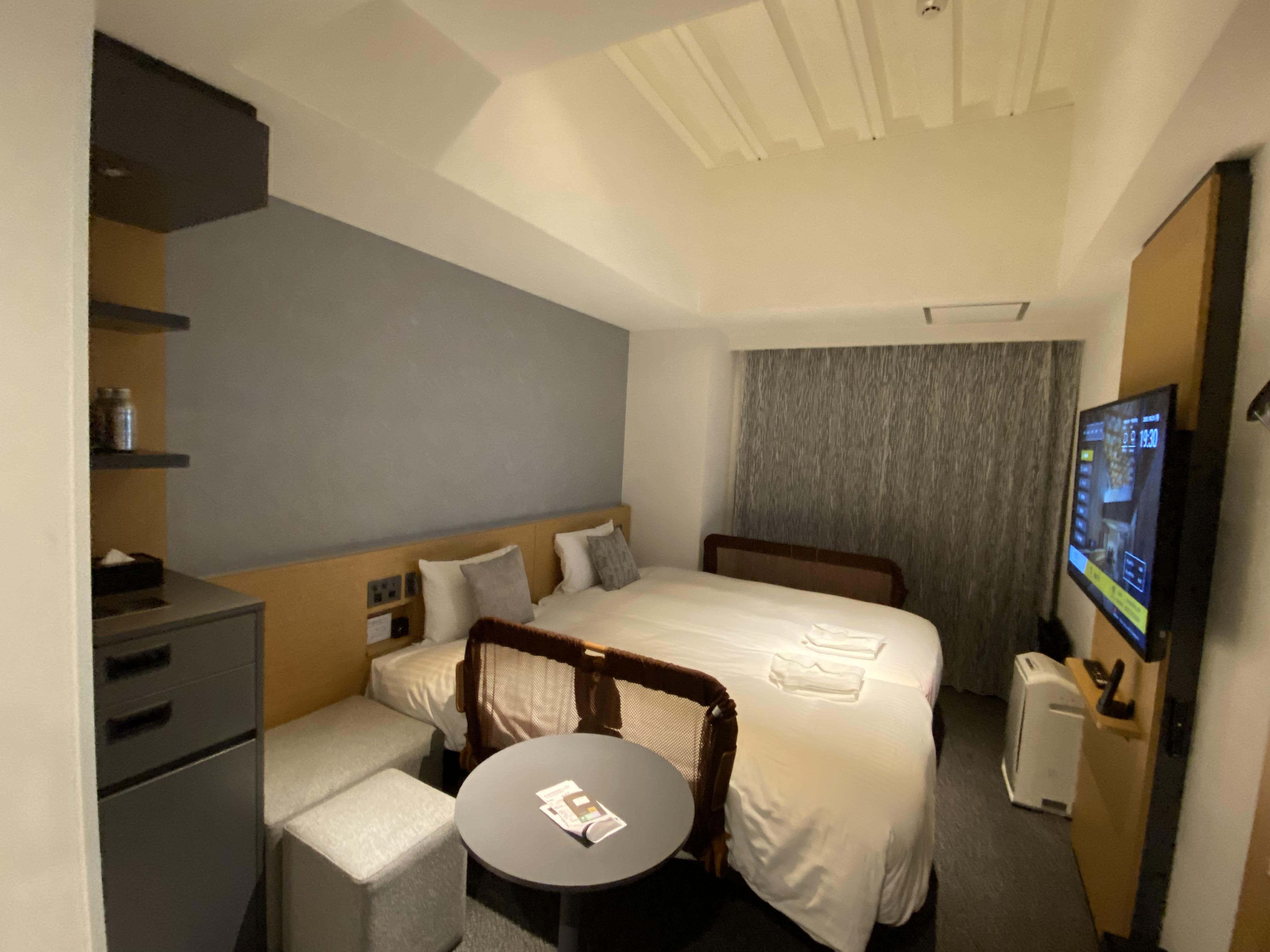 저는 4인+유아1인 총 5인으로 커넥팅 룸을 예약했는데 비즈니스 호텔 치고는 꽤 넓고 신축이라 그런지 쾌적해서 좋았어요. 넓어 보였던 이유 중 하나는 아마 천고가 높아서 그렇지 않았나 싶습니다. 그리고 좀 놀라웠던 점은 혹시 몰라서 요청드린 베드가드가 설치되어 있었고, 트윈베드지만 할리웃베드로 연결이 돼서 킹사이즈처럼 넓게 침대를 사용하였습니다.