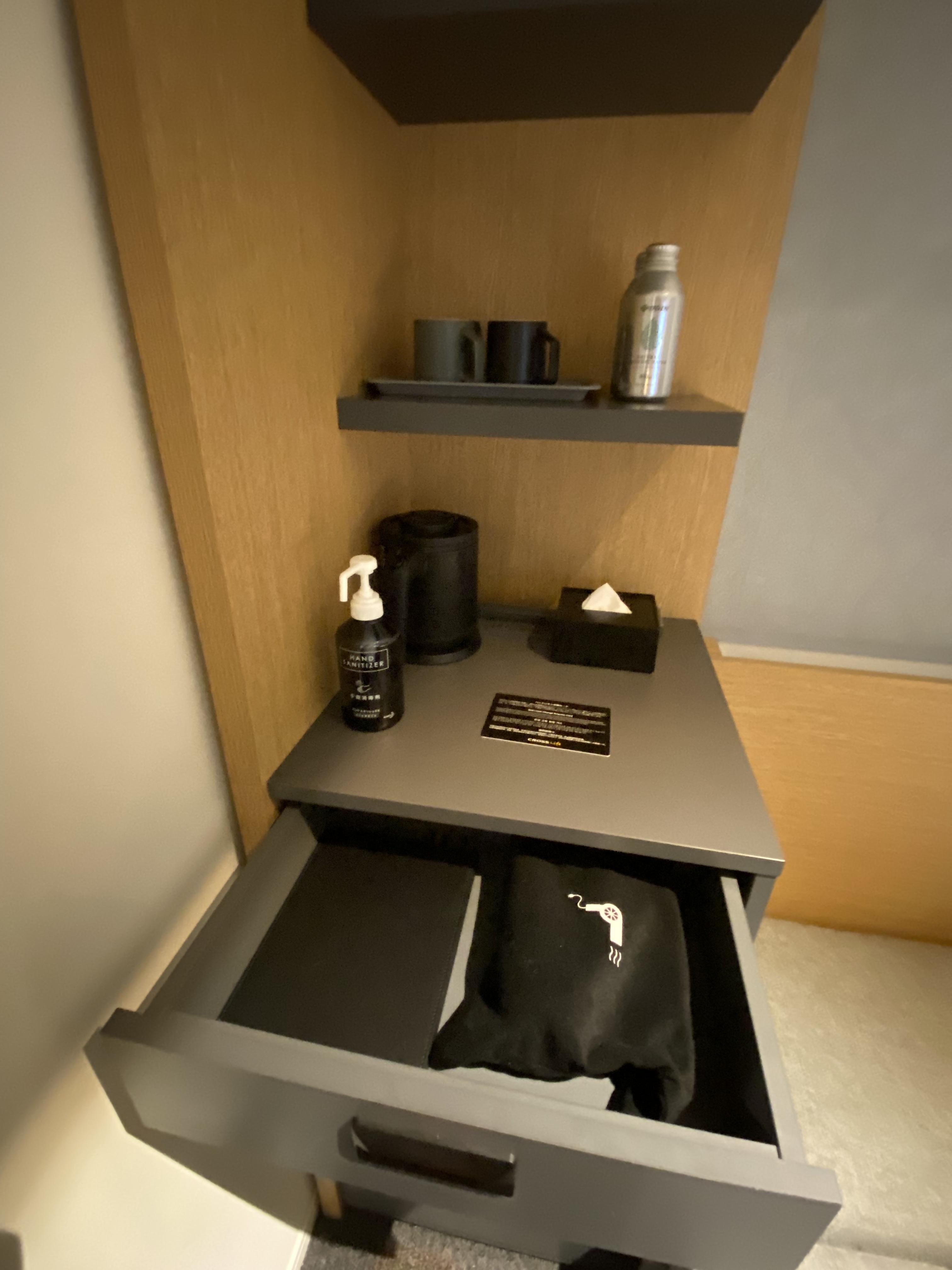 첫 번째 서랍엔 헤어드라이기가 있었고, 두 번째 서랍엔 금고도 있어 편리함을 주었습니다. 저는 해외 갈 때 헤어드라이기를 챙겨갈 만큼 머리 말리는 걸 중요시하는데 돼지코를 했음에도 전압이 안 맞아서 헤어드라이기가 터져 부득이하게 호텔 꺼를 썼는데 왠 걸요~ 바람이 생각보다 강해서 쾌적하게 머리를 말릴 수 있었습니다.