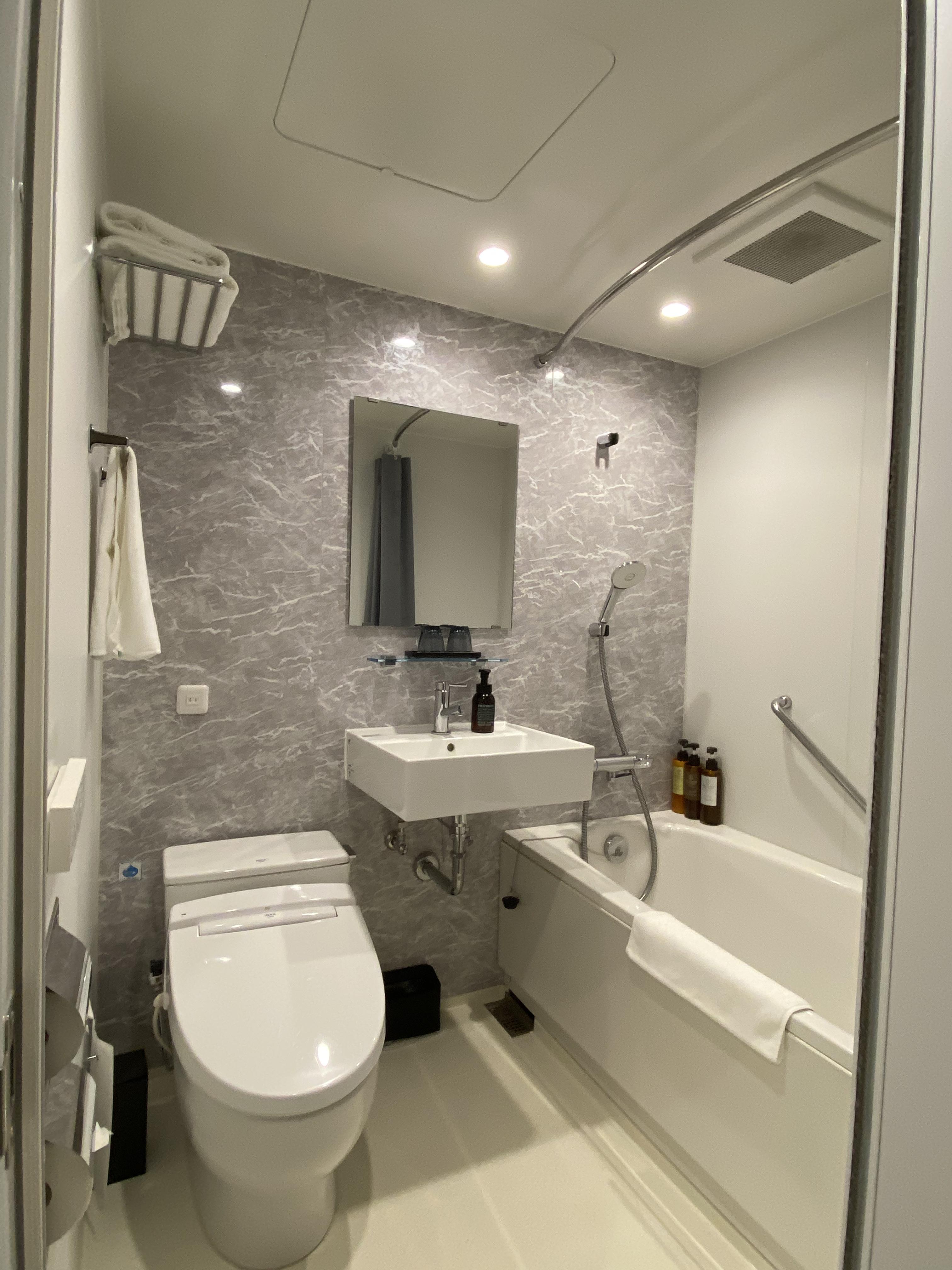 커넥팅 룸이라서 두방이 연결되어있어서 참으로 편리했고, 현관문도 각자 가지고 있어 분리도 가능합니다. 화장실은 아래 사진 보시는 거처럼 깨끗하고 어메니티의 향도 나쁘지 않았습니다. 수건은 2박 3일 묵는 동안 매일 교체해주셨습니다. 일본에 방문하면서 느낀 건데 한국사람들보다 비데를 더 사랑하는 거 같아요. 비즈니스호텔 어디에 가도 비데가 설치되어 있습니다.