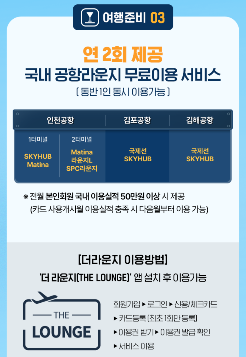 더 라운지 멤버십 제공(전 세계 1,000여 개 공항 라운지 무료 이용 가능)