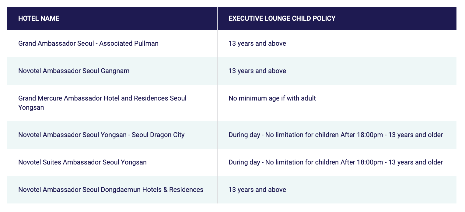 노보텔 앰배서더 서울 용산 : 오전, 오후 유아동반 가능. 오후 6시 이후부터는 만 13세 이상, 클럽라운지 출입 및 이용 가능