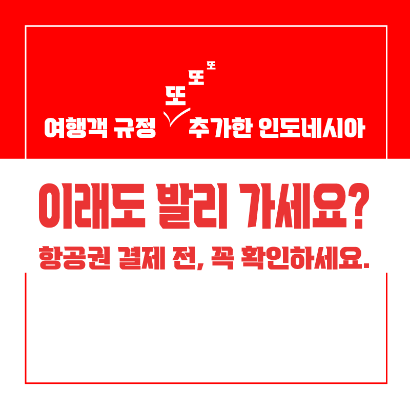 힐링하러 가는 여행에 제가 챙기는 짐까지 제한받는다니 중고등학교에 다시 입학한 느낌입니다. 면제해 준다는 도착비자 면제 소식은 없고 계속해서 아쉬워지는 규정들이 추가되니 좋은 소식도 아쉬운 소식도 발 빠르게 전달해 드리도록 하겠습니다! 모두 행복한 여행준비 하시고, 인도네시아 여행 준비 시 꼭 이러한 규정과 관광세는 알고 가시길 바랍니다.